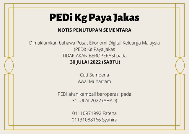28 Julai 2022 | Aktiviti TerkiniDimaklumkan PEDi Kg Paya Jakas tidak akan beroperasi sementara selama 1 hari iaitu pada 30 Julai 2022 (Sabtu) sempena cuti umum Awal Muharam. Maklimat lanjut seperti berikut